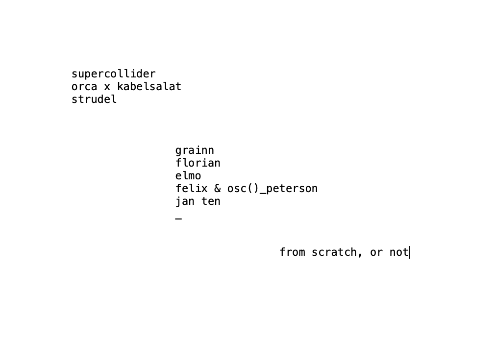 TOPLAP Karlsruhe showcase with Attrique Orgeat, dkyuh, Elmo, luiiuuuiiiii, Lukijanova, Michele Samarotto and Okbaj. » More info - Sunday, February 27th 2022